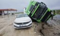 Tır otomobilin üstüne devrildi